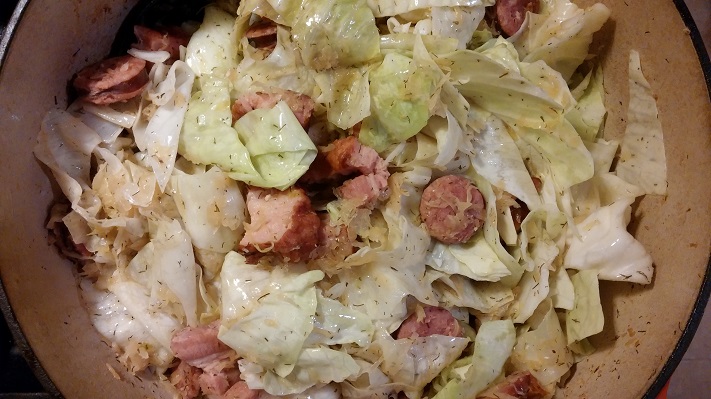 My Mom always made cabbage, usually just sautéed with bacon. But I have taken her recipe and made it a perfect meal all-in-one pot. I don’t know about you but one pot meals are one of my favorite things to prepare during a busy work week. As I mentioned in a recent post, we’re treating our bodies better by eating out less. I’m not saying to stop eating out because we all have our favorite go-to haunts. You know the ones that we pass by on the way home.