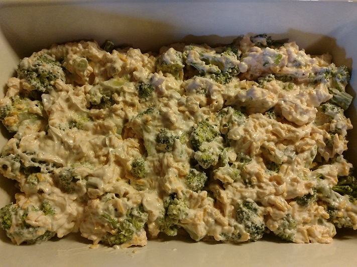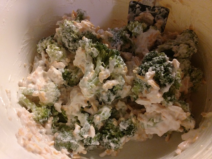 Add in broccoli, stirring until well combined. Spoon and spread broccoli mixture evenly into prepared dish.