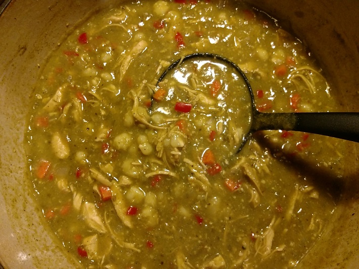 Pour in chile-tomatillo mixture, remaining chicken broth, chicken, and hominy. Add in remaining salt or more if needed.