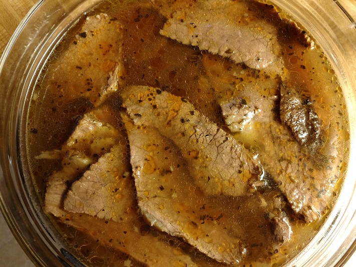 Using a slicing knife or electric knife, cut roast into very thin slices. Place beef slices in a large bowl. Cover beef completely with broth and place covered bowl in refrigerator overnight. Refrigerate any leftover broth for serving. You will have more broth than needed.