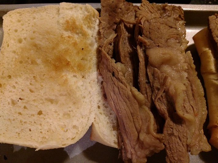 Sounds easy enough, right? Once roast is cool enough to handle, slice into very thin slices with a slicing knife or electric knife. Place meat in a large bowl and cover with au jus completely. Any leftover broth can also be refrigerated for serving. Now the day when ready to serve heat up beef and au jus.
