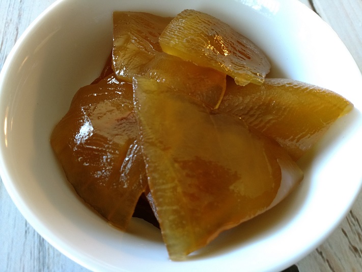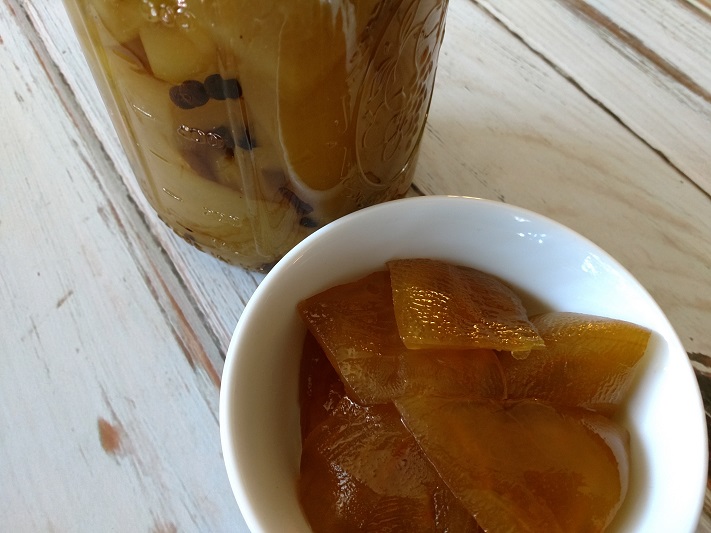 Discard any solids if desired and add in watermelon rind and lemon slices, cooking until rind is translucent, about 30 minutes.