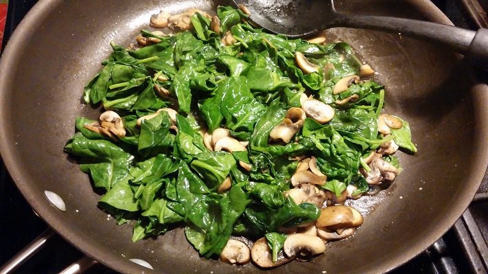 Place oven rack in center of oven and preheat oven to 450 degrees. In a 12-inch ovenproof skillet, heat 2 T. olive oil over medium-high heat until hot. Add mushrooms and sprinkle with ½ t. salt and pepper. Cook, stirring, about 3 minutes. Add spinach, sprinkle with salt and cook until wilted, about 2 minutes. Place spinach mixture in colander to drain; set skillet aside.