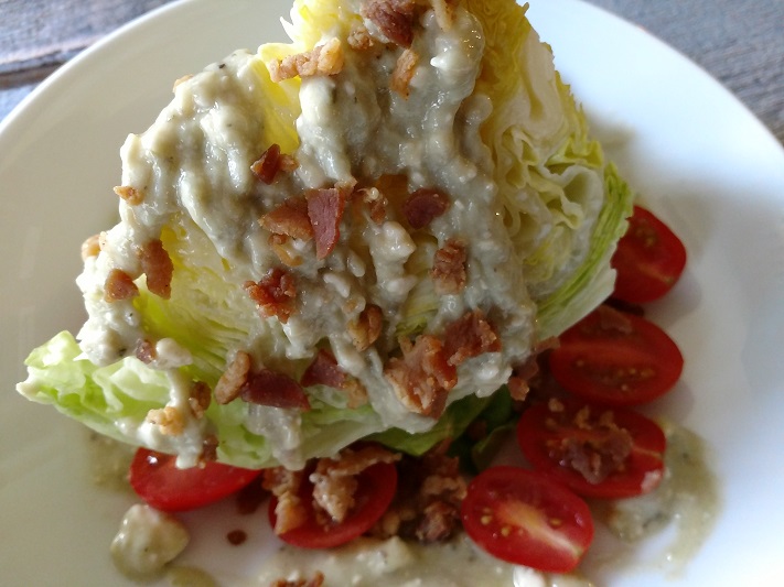 Not sure why I don’t make this salad more than I do because it is so easy to prepare. Simple and easy always works in my book. Just cut the head of lettuce into 4 wedges and slice grape tomatoes in half. Crumble cooked bacon or buy a package of crumbled bacon. The best part of this salad is the blue cheese vinaigrette. It’s not your normal poured dressing, as a result is on the thicker side.